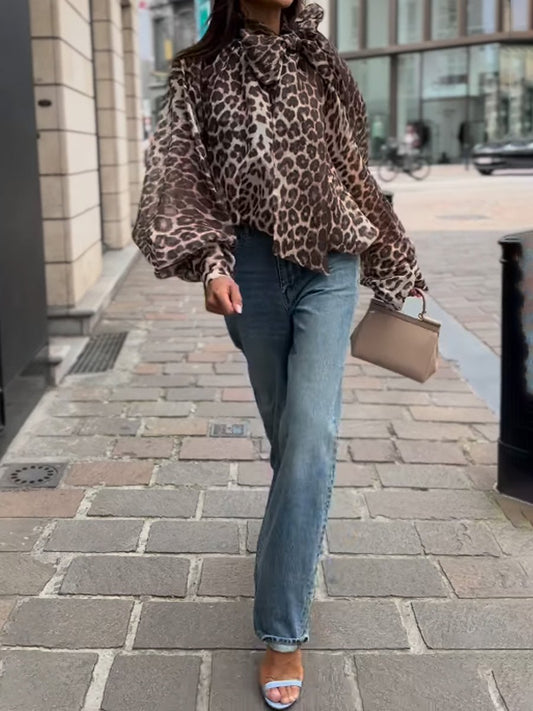 Leopard Printed Bow Long Sleeve Women's Blouse