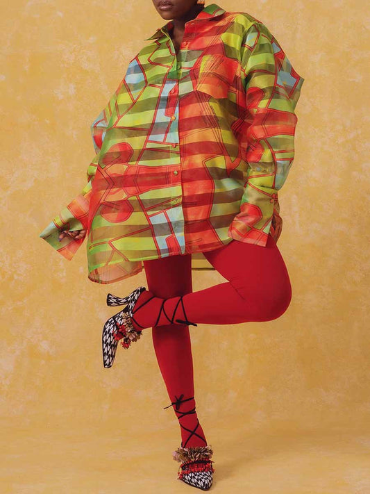 Organza Oversized Long Sleeve Print Shirt Dress