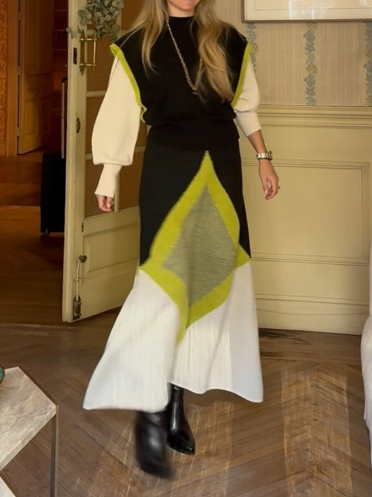Fashion Elegant Knitted Patchwork Sweater 2-piece Dress